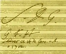 The Baroque composer Johann Sebastian Bach wrote the initials "S. D. G." at the end of all his church compositions and also applied it to some, but not all, his secular works.[2] This dedication was at times also used by Bach's contemporary George Frideric Handel, e.g. in his Te Deum.[6] The 16th century Spanish mystic and poet St. John of the Cross used the similar phrase, Soli Deo honor et gloria, in his Precautions and Counsels.[7]