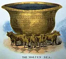 According to the Hebrew Bible, the Molten Sea or Brazen Sea (ים מוצק "cast metal sea") was a large basin in the Temple for ablution of the priests. It is described in 1 Kings 7:23–26 and 2 Chronicles 4:2–5. It stood in the south-eastern corner of the inner court. According to the Bible it was five cubits high, ten cubits in diameter from brim to brim, and thirty cubits in circumference. The brim was "like the calyx of a lily" and turned outward "about an hand breadth"; or about four inches. It was placed on the backs of twelve oxen, standing with their faces outward. The Book of Kings states that it contains 2,000 baths (90 cubic meters), while Chronicles (2 Chr. 4:5–6) states it can hold up to 3,000 baths (136 cubic meters) and states that its purpose was to afford opportunity for the purification by immersion of the bodies of the priests.