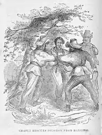 Under Tibaut, Northup suffered cruel and capricious treatment. Tibaut used him to help complete construction at Ford's plantation. At one point, Tibaut whipped Northup because he did not like the nails Northup was using. But Northup fought back, beating Tibaut severely. Enraged, Tibaut recruited two friends to lynch and hang the slave, which a master was legally entitled to do. Ford's overseer Chapin interrupted and prevented the men from killing Northup, reminding Tibaut of his debt to Ford, and chasing them off at gunpoint. Northup was left bound and noosed for hours until Ford returned home to cut him down.[28] Northup believed that Tibaut's debt to Ford saved his life. Historian Walter Johnson suggests that Northup may well have been the first slave Tibaut ever bought, marking his transition from itinerant employee to property-owning master.[29]