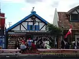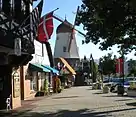 Initially, most of Solvang's buildings were built in the same style as others in the area.[25] The Lutheran church was the first to be based on Danish architecture and bears a close relationship to Danish equivalents. But after World War II, interest grew in the concept of a "Danish Village". The pioneer of the Danish Provincial style was Ferdinand Sorensen, originally from Nebraska. In the mid-1940s, after returning to Solvang from a trip to Denmark, he first completed Møllebakken, his Danish-styled home, and then went on to build the first of the village's four windmills. A little later, Earl Petersen, a local architect, gave the older buildings a new look, adding façades in so-called "Danish Provincial" style.[26][27] Buildings in the half-timbered style of Danish rural houses proliferated, creating a new tourist attraction.[9] While much was done to create an "authentic" Danish atmosphere in the town center, it has been pointed out by Scandinavians that fake thatched roofs and artificial timbering are largely a result of local interests in general rather than those of the Danish immigrants themselves. The older buildings have simply been restyled to look Danish even if there was nothing Danish about them originally.[28]