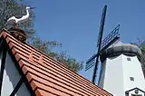 Stork on a rooftop and Danish windmill