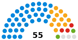 Until the early 1970s, the County Council still included aldermen. Of a total of 92 members, 69 were elected every three years by ratepayers, and 23 were aldermen, chosen by the 69 elected members. The aldermen served for six years, so after each triennial election either eleven or twelve were appointed, these numbers alternating.[22] Until 1910, the outgoing aldermen could also vote on such appointments. As voting members of the council, aldermen were finally abolished in 1974 under the Local Government Act 1972[23] so that there are now only the elected members, each of the fifty-five present county divisions electing a single member.