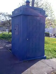The Somerton police box became known in Newport as the TARDIS as a reference to the television series Doctor Who, in which the Doctor's time machine appears as a police box due to its chameleon circuit being stuck.[1] During the 1980s local residents painted a long multi-coloured scarf on the blue police box as worn by the fourth Doctor, played by actor Tom Baker 1974–1981.