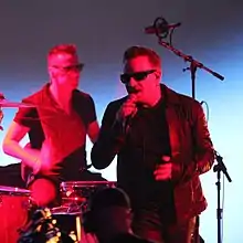 To promote the album, the band made appearances on several television and radio programs, including RAI TV's Che tempo che fa in Milan,[119] Canal+'s Le Grand Journal in Paris,[120] BBC One's The Graham Norton Show[121] and BBC Radio 2 in London,[122] BBC Two's Later... with Jools Holland,[123] and RTÉ One's The Late Late Show in Dublin.[124] The group also performed "Every Breaking Wave" at the 2014 MTV Europe Music Awards.[125] The promotional tour was interrupted when Bono was injured in a "high energy bicycle accident" in Central Park on 16 November 2014. He suffered fractures of his shoulder blade, humerus, orbit, and pinky finger, requiring five hours of surgery at NewYork–Presbyterian Hospital/Weill Cornell Medical Center's Emergency Department.[126] Bono said he was uncertain that he would ever be able to play guitar again.[127] The injury forced the band to cancel a headlining appearance at KROQ Almost Acoustic Christmas,[128] as well as a week-long residency as the musical guest on The Tonight Show Starring Jimmy Fallon.[129] The other three members of U2 kept a commitment to perform in Times Square on World AIDS Day on 1 December 2014; Chris Martin of Coldplay and Bruce Springsteen filled in as lead vocalists.[130] U2 returned to The Tonight Show on 8 May 2015, and participated in sketches in which they mocked Bono's bicycle injury and busked in a New York City Subway station in disguise. The group also unveiled a video previewing their Innocence + Experience Tour.[131] To recompense the Los Angeles area for dropping out of KROQ Almost Acoustic Christmas, the band performed for 500 fans at the Roxy Theatre in Hollywood on 28 May 2015 while between shows of their arena tour.[132]