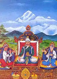 Songtsen Gampo[1] (Tibetan: སྲོང་བཙན་སྒམ་པོ, Wylie: srong btsan sgam po ; 569–649?), also Songzan Ganbu (Chinese: 松贊干布; pinyin: Sōngzàn Gānbù), was the 33rd Tibetan king and founder of the Tibetan Empire,[lower-alpha 1] and is traditionally credited with the introduction of Buddhism to Tibet, influenced by his Nepali consort Bhrikuti, of Nepal's Licchavi dynasty, as well as with the unification of what had previously been several Tibetan kingdoms.[2] He is also regarded as responsible for the creation of the Tibetan alphabet and therefore the establishment of Classical Tibetan, the language spoken in his region at the time, as the literary language of Tibet.