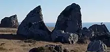 Some of the oldest natural history of this area related to mammals are a blueschist rock formation about one mile (1.6 km) south of the Russian River. There is found a sea stack formation with prominent rubbing marks about two to four meters in elevation, a height too high to have been caused by modern bovids. Mammoths are believed to have roamed here as recently as 40,000 years ago, and they are thought to have created these severe rubbing marks.[2] Mammoth fossil remains have been found at Bodega Head at the south end of Sonoma Coast State Park.