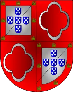 The field of the shield is divided in four quarters (quarterly or party per cross) with the royal arms of Portugal in the first and fourth quarters, and the arms of Sousa, a quartet of silver crescents (Argent) over a field of red (Gules), in the second and third quarters. This grouping known as the Sousa of Arronches (because of the title of Lords of Arronches), is still borne by many of the noble houses of Portugal, like the Dukes of Palmela.