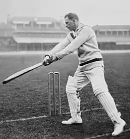 The following season, in 1922–23, an English cricket team toured. Just like nine years, previous Taylor was at his best. In the first Test at Johannesburg, he batted at number three and in the second innings scored a superb 176, the next highest score in the match was 50.[30] Taylor's knock included 25 boundaries and was the largest by a South African against England.[31] South Africa won the Test by 168 runs, it was Taylor's first victory as captain and as a Test player.[32] He followed that in the second Test with scores of 9 and 68 as England narrowly won by one wicket.[33] In the third Test at Durban he was moved back up to open the innings, he scored 91 and shared 110 with Bob Catterall. The third day's play was washed out leaving the draw inevitable in a four-day match.[34] The fourth Test was also drawn, Taylor scored 11 at number four and then moved back as the opener in the second innings made 101. Wisden wrote: "Taylor, who hit out freely when fear of defeat had gone, played a masterly game, but he had a little luck".[35] With the series still level at 1–1, the fifth and final Test was made Timeless to ensure a winner of the series. England's C. A. G. Russell scored two centuries in the match and South Africa were set a target fourth innings target of 344. Taylor, at number four, batted for four and a half hours over an innings of 102 however he received little support from his teammates and South Africa lost by 109 runs.[36] Taylor finished the series with 582 runs at 64.66 and was the highest scorer on either side, his total was 278 more than the next South African.[37] His series total was at the time a Test record for a captain, later surpassed by Don Bradman in 1936.[38] His three centuries in the series set a South African Test record which was only bettered in 2003/04 by Jacques Kallis.[39] The Wisden report of the series recorded that "H. W. Taylor as a batsman was in a class by himself".[40] The series cemented Taylor's position as a leading batsman in the world.