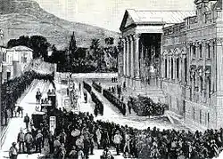 In 1871, the discovery of diamond deposits by prospectors in Griqualand led to a struggle for control between Britain, the Orange Free State, the Griqua state and the Transvaal.[62] A Griqua chief claimed the land that the mines were located on belonged to him and asked for the protection of the British Government. This action resulted in the British annexation the region which became known as Griqualand West.[63] This land was originally given to the Orange Free State by the British in 1854. The Orange State was pressurised by the Earl of Carnarvon to become part of the plan to confederate the countries of Southern Africa under British rule, but it refused. Eventually, the Orange Free State was compensated by payment of $525,000 and although it joined in some of the meetings about confederation, it still rejected the plan.[64] In 1880, Griqualand West was handed by the British to the Cape Colony, within which it became a separate province. This allowed for Cecil Rhodes' entrance into Cape Colony politics to further his agenda as one of the mining magnates when he stood for election to parliament in Barkly West.[65]