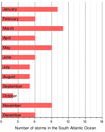 There have been over 82 recorded tropical and subtropical cyclones in the South Atlantic Ocean since 1957. Like most southern hemisphere cyclone seasons, most of the storms have formed between November and May.