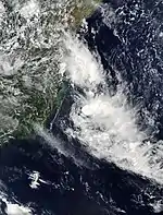 Early on March 14, 2011, the Navy Hydrographic Center-Brazilian Navy (SMM), in coordination with the National Institute of Meteorology, were monitoring an organizing area of convection near the southeast coast of Brazil.[17] Later that day a low pressure area developed just east of Vitória, Espírito Santo,[18] and by 12:00 UTC, the system organized into a subtropical depression, located about 140 km (87 mi) east of Campos dos Goytacazes.[19] Guided by a trough and a weak ridge to its north, the system moved slowly southeastward over an area of warm waters,[20][21] intensifying into Subtropical Cyclone Arani on March 15,[22] as named by the Brazilian Navy Hydrographic Center. The storm was classified as subtropical, as the convection was east of the center. On March 16, Arani began experiencing 25 kn (13 m/s; 46 km/h; 29 mph) of wind shear because another frontal system bumped it from behind.[24]