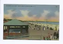 The plans called for a 180-foot-wide (55 m) beach to be built before the boardwalk, but construction did not progress in that exact sequence, which resulted in some parts of the boardwalk site being flooded at high tide. As a result, WPA employees sometimes worked 6-hour days and other times worked less than 4 hours in a day.[56] Nevertheless, the boardwalk was built relatively quickly, and the first 1-mile (1.6 km) section between Fort Wadsworth and South Beach was nearly completed by the end of 1936.[57] Twelve jetties and a parallel beach section had also been completed, though a section across New Creek in Midland Beach was progressing slowly.[55] By June 1937, the entire boardwalk was essentially completed.[58] An official opening ceremony was held on July 4, 1937, and was attended by 25,000 people. Upon its opening the boardwalk was named after U.S. president Franklin D. Roosevelt, who participated in the ceremonies remotely.[36][59][60]
