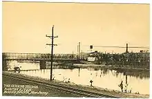A wooden bridge over the Raritan River was erected as early as 1761 and named Queen's Bridge in 1767. Later, it became a covered bridge. During the Revolutionary War, the bridge was used repeatedly by both sides including during the Battle of Bound Brook in 1777. In 1875, the wooden bridge was replaced by a steel pipe truss bridge.[27] More than 100 years later, that bridge was itself replaced by a steel girder bridge in 1984, still using the old pillars.[28] The bridge was renovated and paved in 2007.