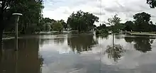Where the South Branch flows through DeKalb County flood stage is 10.0 feet (3 m).[7] Dating back to 1926 the South Branch has risen above flood stage nine times.[7] The record flood occurred on July 2, 1983, when the river reached 15.8 feet (4.8 m). Flash flooding, which predominantly occurs in mid to late summer, can occur throughout the county in low-lying areas on the flood plain.[7] Flooding resulting in a federal disaster declaration occurred in 1973, 1974, 1993, 1996 and 2007.[7][8]