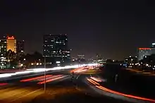 The edge city is served by the San Diego (I-405), Costa Mesa (SR-55), and San Joaquin Hills (SR-73) freeways. During rush hour, the 405-55 interchange becomes one of the most congested in the United States, with an average daily traffic volume of 433,000 cars.[14] The congestion has worsened in recent years despite an upgrade completed in 2005 which included the addition of carpool lane connectors.