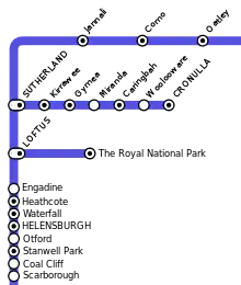 At Sutherland, three platforms are provided. The Cronulla line branches off in an eastwards direction south of the station. The former short branch line to Woronora Cemetery branched in a westerly direction at the south of the platforms. The line opened on 28 July 1900 and closed on 27 August 1944.[23] The line then continues south through Loftus, Engadine, and Heathcote. South of Loftus, the former Royal National Park line branched off, this has now been converted into a tram line connecting to the Sydney Tramway Museum, and connections to the mainline have been severed. The final station for the operation of suburban services is Waterfall station. At Waterfall, there is a train stabling yard and a train turnback (shunting road) south of the station. South of Waterfall is the site of the 2003 Waterfall train disaster.