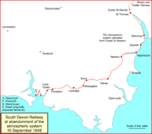 On 18th August a goods train of eleven trucks, weighing 120 long tons (122 t; 134 short tons), travelled the 8 1⁄4 miles (13.3 km), Exeter to Starcross, in 15 minutes.[note 8] On 8th September 1847, besides the usual service of trains hauled by locomotives, four extra ones commenced running, these being propelled by the atmospheric system. This was the first public use of the system on the South Devon Railway. Although the line was opened as far as Newton Abbot, between that station and Teignmouth locomotives were employed, but the piston carriage on the down train went on to Newton, where it was taken off with the superfluous carriages and placed on a convenient line to be attached to the up train when required, so that, on arriving at Teignmouth, where the locomotive was removed, the piston carriage started the train when the signal was given.[14]