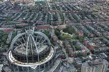 Starting in 1955, nearly all of the buildings in the New York Streets district were bulldozed as part of an urban renewal project to clear "slums" and make room for industrial activity in a period marked by urban decline. The resulting superblock was redeveloped into the headquarters for one of the city's newspapers.[19] The Herald-Traveler Corporation spanned from the then newly minted Herald Street to Traveler Street until 2012, when it moved to the Seaport District in South Boston.[22] Redevelopment as mixed-use area known as Ink Block, featuring apartments, a grocery store, restaurants, and other retail.[19] Other populated sites in the South End received similar treatment, particularly the early high-rise, high density Cathedral Housing Projects adjacent to Holy Cross Cathedral and the high- and low-rise redevelopments like Castle Square from 1964-1966.[23]