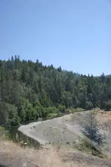 After the confluence with Tenmile Creek, the South Fork flows generally north, turning west where it receives another major tributary, 11-mile (18 km) Rattlesnake Creek, also on the right.[9] This point is significant because it is where it begins to parallel U.S. Highway 101 and California State Route 271 (Redwood Highway and Old Redwood Highway). Both roads come in from the east and at this point are on the river's right bank.[6] The river turns northwest, receiving Big Dann Creek and another large 9-mile (14 km) tributary, Cedar Creek, on the right bank. Cedar Creek flows west and turns south-southwest, flowing also in a steep, undeveloped gorge. Shortly past Cedar Creek, the South Fork Eel meets another large tributary, Hollow Tree Creek. Hollow Tree Creek flows east, turns north, then turns east again to meet the South Fork, fed by several smaller creeks. The South Fork then turns west again, flowing through the Standish Hickey State Recreational Area. It then meanders north into Richardson Grove State Park on an increasingly wide valley floor, receiving Red Mountain Creek on the right bank.[6]