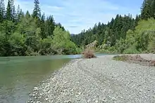 The river provides wildlife habitat for preservation of rare and endangered species including cold freshwater habitat for fish migration and spawning.[16] The South Fork Eel was historically rich in salmon and other species of anadromous fish, and has been known as the "most productive sub-basin for anadromous fish".[34] The main anadromous fishes in the South Fork are chinook salmon, coho salmon and steelhead, and it is said that "the South Fork Eel River once supported about half of the total coho run for the State of California".[34] Historically, the population of chinook was 20,000 while coho averaged 16,000 at Benbow Dam in the 1930s. Since then, the population has steadily declined, with a current population of roughly 1,000. The reason for the decline is the high amount of silt carried into the river by logging activity and road construction. The silt has filled stream pools and caused higher turbidity, which has harmed fish.[34] The South Fork is said to be the last habitat in the State of California for wild coho.[35]