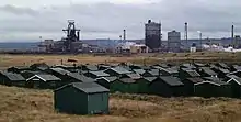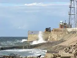 Near the end of the breakwater, in the fenced compound, there is a tall steel framed mast, housing air speed measurement devices. These devices gather data on wind speeds at various heights for a planned offshore wind farm proposed by Northern Offshore Wind Limited.[28] The mast is 164 feet (50 m) tall and 15.3 feet (4.7 m) wide at the base. Plans for the offshore wind farm include thirty 200 feet (61 m) windmills over 1 mile (1.6 km) offshore. AMEC Wind has plans to site 19 wind turbines inside Corus steelworks generating 47.5 MW of electricity.[28]