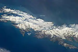 South Georgia and the South Sandwich Islands (SGSSI) is a British Overseas Territory in the southern Atlantic Ocean. It is a remote and inhospitable collection of islands, consisting of South Georgia and a chain of smaller islands known as the South Sandwich Islands. South Georgia is 165 kilometres (103 mi) long and 35 kilometres (22 mi) wide and is by far the largest island in the territory. The South Sandwich Islands lie about 700 kilometres (430 mi) southeast of South Georgia. The territory's total land area is 3,903 km2 (1,507 sq mi).[1] The Falkland Islands are about 1,300 kilometres (810 mi) west from its nearest point.