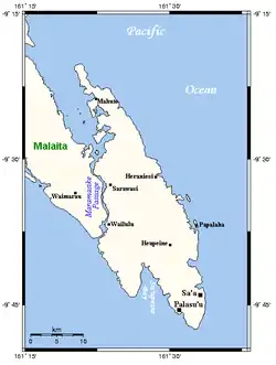 South Malaita Island, also known as Small Malaita and Maramasike for Areare speakers and Malamweimwei known to more than 80% of the islanders, is the island at the southern tip of the larger island of Malaita in the eastern part of the Solomon Islands.[1] It is called "small" to distinguish it from the much larger mainland. It is now part of Malaita Province. South Malaita came under effective control of the colonial administration after the Solomon Islands was declared a British Protectorate in 1893. The administration included the collection of taxes from the islanders.[2] During the colonial days, the island was divided by the colonial government and missionary establishments into the Asimeuri, Asimae, and Raroisu'u districts. Away from Malaita, most people from "Small" or "South" Malaita usually just say the word "South", everyone knows what they mean.