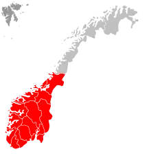 South Norway (Norwegian: Sør-Norge, Northern Sami: Lulli-Norga) is the southern and by far most populous half of Norway, consisting of the regions of Western Norway, Eastern Norway, Southern Norway (Agder) and Trøndelag (Central Norway).[1] In English South Norway was historically also known as Norway Proper, a term that often has a broader meaning in contemporary usage.[2]
