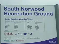![]() The new Park sign at South Norwood Recreation Ground | |