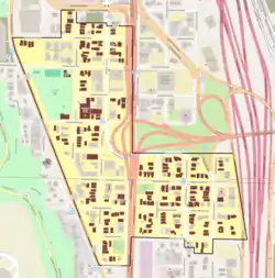 The 31-block area is irregular in shape, bounded by Southwest Barbur Boulevard to the west and Southwest Hood Street to the east. Southwest Meade and Arthur Streets define much of the northern boundary.[2]