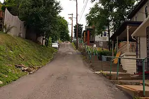 The Mission Street steps between Oakley Street and Barry Street in addition to the top of Yard Way off Pius St. offer views of the South Side Flats neighborhood and downtown Pittsburgh. These public staircases are sometimes called paper streets, being pedestrian streets shown on City maps but not accessible by vehicles.