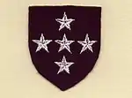 During the Second World War and after, Southern Command, in common with other UK Commands, used its formation sign as a badge, (or flash) on uniforms. The HQ sign itself (see top of this article) with its horizontal red, black, red background colouring indicated an army level command, on which were five stars of the Southern Cross. Uniquely in Southern Command the background colour of the shield, and occasionally the stars, was changed to show the colours of the service corps of the personnel, other commands used their formation sign with an arm of service stripe (1⁄4 inch (0.64 cm) thick) below it. The various designs and changes for visibility or similarity are shown below.[16]
