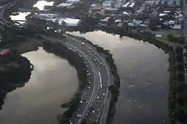 An aerial view of the Southern Cross Drive in 2012 with the Botany Lakes and the Mill Steam astride the road.