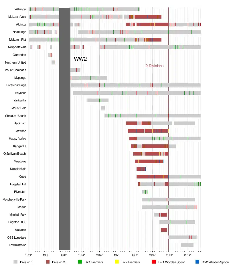 The League was formed (as Southern Football Association) in 1886 with competing clubs being Aldinga, McLaren Vale, Sellicks Hill and Willunga.[1] In the early 1900s the participating clubs were Aldinga, Hillside (called McLaren Flat from 1946), McLaren Vale, Morphett Vale, Noarlunga and Willunga.