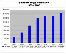 The 1980 national census recorded the province of Southern Leyte with a population of 296,294 from the historic record in 1903 of 72,369. In 1990, the population of the province increased to 321,940 which was caused by in-migration and increasing rate of birth over death. In 2000, population increased to 360,160 with a rate of 2.73 from the negative growth rate recorded in 1995 period with 317,565.[24] The sudden decrease of the 1995 records was due to the late census in the province. While regular censuses were done in May where most of the students were at their respective places of residence, in 1995 the census on population was done in September where the students were out for schooling in nearby provinces. The decrease in population was also, theoretically, attributed to out-migration of the rural population to cities to seek better employment and livelihood opportunities. A corresponding increase on the number of households was also recorded at 72,894 households higher by 7,327 households over the 1995 figure. Southern Leyte ranked fifth in terms of population among the six provinces in Eastern Visayas with 9.98 percent of the 3.6 million persons of the region. On the contrary, it was the fastest-growing province in the region. At the national level, the province contributed 0.47 percent to the total population of the Philippines with 76.5 million.[24]