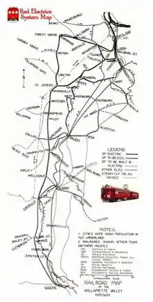 The Southern Pacific Red Electric Lines, also known simply as the Red Electric, was a network of interurban passenger train services operated by the Southern Pacific Railroad in the Willamette Valley of the U.S. state of Oregon from 1914 to 1929.[1] The service got its name from the bright red color of its cars.[2][3][note 1] Despite its short history, among West Coast interurbans it was unique, and it was considered the finest such system in the Pacific Northwest.[2] It was the only major electric interurban railroad converted from steam to electric passenger use.[2] It was also one of few systems using all-steel equipment, and one of the largest 1500-volt systems in the country.[2]