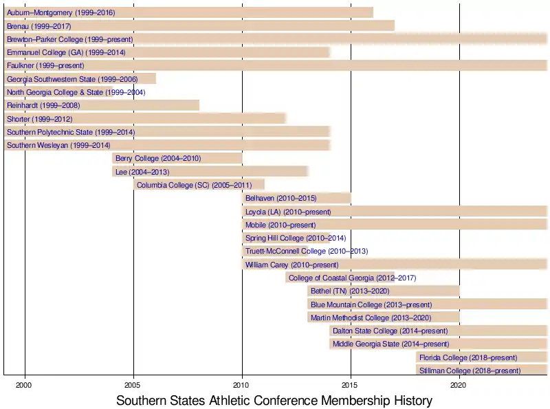 The Southern States Athletic Conference was established as the Georgia Alabama Carolina Conference on March 16, 1999. On June 27, 2004, the conference changed its name to the Southern States Athletic Conference.[1]