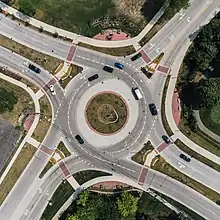 Two sculptures by local artists sit in the center of the two traffic roundabouts that are on Evergreen Road. Diversity, by John Piet, former art professor at Macomb Community College and 35-year resident of Southfield sits in the center of the northern Evergreen Road roundabout.[24] Gratitude, by nationally-acclaimed Southfield sculptor Jay Lefkowitz, sits in the southern Evergreen Road roundabout.[25][26]