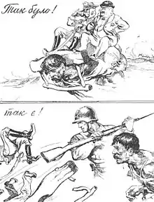 The response of non-ethnic Poles to the situation caused considerable complications. Many Ukrainians, Belarusians and Jews welcomed the invading troops.[99] Local Communists gathered people to welcome the Red Army troops in the traditional Slavic way by presenting bread and salt in the eastern suburb of Brest. A sort of triumphal arch on two poles, decked with spruce branches and flowers was fashioned for this occasion. A slogan in Russian on a long red banner, glorifying the USSR and welcoming the Red Army, crowned the arch.[100] The event was recorded by Lev Mekhlis, who reported to Stalin that the people of the West Ukraine welcomed the Soviet troops "like true liberators".[101] The Organization of Ukrainian Nationalists rebelled against Polish rule and Communist partisans stirred up local revolts, such as in Skidel.[1]