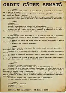 In a declaration to the local population, the Soviet command stated: "The great hour of your liberation from the yoke of Romanian boyars, landowners, capitalists and Siguranța has arrived".[70]