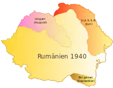 The Soviet Union had planned to accomplish the annexation with a full-scale invasion, but the Romanian government, responding to the Soviet ultimatum delivered on June 26, agreed to withdraw from the territories to avoid a military conflict. The use of force had been made illegal by the Conventions for the Definition of Aggression in July 1933, but from an international legal standpoint, the new status of the annexed territories was eventually based on a formal agreement through which Romania consented to the retrocession of Bessarabia and cession of Northern Bukovina. As it was not mentioned in the ultimatum, the annexation of the Hertza region was not consented to by Romania, and the same is true of the subsequent Soviet occupation of the Danube islands.[1] On June 24, Nazi Germany, which had acknowledged the Soviet interest in Bessarabia in a secret protocol to the 1939 Molotov–Ribbentrop Pact, had been made aware prior to the planned ultimatum but did not inform the Romanian authorities and was willing to provide support.[5] On June 22, France, a guarantor of Romanian borders, fell to Nazi advances. This is considered to be an important factor in the Soviets' decision to issue the ultimatum.[6] The Soviet invasion of Bukovina in 1940 violated the Molotov-Ribbentrop Pact, since it went beyond the Soviet sphere of influence that had been agreed with the Axis.[7]