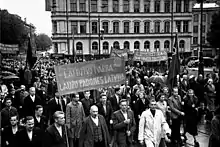 Most of the Estonian Defence Forces and the Estonian Defence League surrendered according to the orders of the Estonian Government and were disarmed by the Red Army.[24][25] Only the Estonian Independent Signal Battalion stationed in Tallinn at Raua Street showed resistance to the Red Army and "People's Self-Defence" Communist militia,[26] fighting the invading troops on 21 June 1940.[27] As the Red Army brought in additional reinforcements supported by six armoured fighting vehicles, the battle lasted several hours until sundown. Finally the military resistance was ended with negotiations and the Independent Signal Battalion surrendered and was disarmed.[28] There were two dead Estonian servicemen, Aleksei Männikus and Johannes Mandre, and several wounded on the Estonian side and about ten killed and more wounded on the Soviet side.[29][30] The Soviet militia that participated in the battle was led by Nikolai Stepulov.[31]