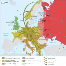 In September and October 1939 the Soviet government compelled the much smaller Baltic states to conclude mutual assistance pacts which gave the Soviets the right to establish military bases there. Following invasion by the Red Army in the summer of 1940, Soviet authorities compelled the Baltic governments to resign. The presidents of Estonia and Latvia were imprisoned and later died in Siberia. Under Soviet supervision, new puppet communist governments and fellow travelers arranged rigged elections with falsified results.[1] Shortly thereafter, the newly elected "people's assemblies" passed resolutions requesting admission into the Soviet Union. In June 1941 the new Soviet governments carried out mass deportations of "enemies of the people". Consequently, at first many Balts greeted the Germans as liberators when they occupied the area a week later.[2]