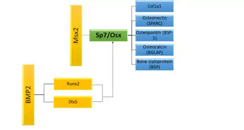 There are two main pathways which cause in the induction of Sp7/Osx gene expression, indirectly or directly. Msx2 has the ability to directly induce Sp7. Whereas BMP2 indirectly induces Sp7 through either Dlx5 or Runx2.[8] Once Sp7 expression is triggered it then induces the expression of a slew of mature osteoblast genes such as Col1a1, osteonectin, osteopontin and bone sialoprotein which are all necessary for productive osteoblasts during the creation of ossified bone.[6]