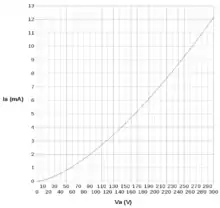 where Ia is the anode current and S the surface area of the anode receiving the current; is the magnitude of the charge of the electron and is its mass. The equation is also known as the "three-halves-power law" or the Child–Langmuir law. Child originally derived this equation for the case of atomic ions, which have much smaller ratios of their charge to their mass. Irving Langmuir published the application to electron currents in 1913, and extended it to the case of cylindrical cathodes and anodes.[4]