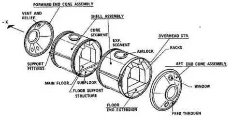 Spacelab consisted of a variety of interchangeable components, with the major one being a crewed laboratory that could be flown in Space Shuttle orbiter's bay and returned to Earth.[8] However, the habitable module did not have to be flown to conduct a Spacelab-type mission and there was a variety of pallets and other hardware supporting space research.[8] The Habitable module expanded the volume for astronauts to work in a shirt sleeve environment and had space for equipment racks and related support equipment.[8] When the habitable module was not used, some of the support equipment for the pallets could be housed in the smaller Igloo, a pressurized cylinder connected to the Space Shuttle orbiter crew area.[8]