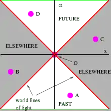 The light cone has an essential role within the concept of causality. It is possible for a not-faster-than-light-speed signal to travel from the position and time of O to the position and time of D (Fig. 2‑4). It is hence possible for event O to have a causal influence on event D. The future light cone contains all the events that could be causally influenced by O. Likewise, it is possible for a not-faster-than-light-speed signal to travel from the position and time of A, to the position and time of O. The past light cone contains all the events that could have a causal influence on O. In contrast, assuming that signals cannot travel faster than the speed of light, any event, like e.g. B or C, in the spacelike region (Elsewhere), cannot either affect event O, nor can they be affected by event O employing such signalling. Under this assumption any causal relationship between event O and any events in the spacelike region of a light cone is excluded.[29]