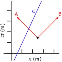A spacetime diagram is typically drawn with only a single space and a single time coordinate. Fig. 2‑1 presents a spacetime diagram illustrating the world lines (i.e. paths in spacetime) of two photons, A and B, originating from the same event and going in opposite directions. In addition, C illustrates the world line of a slower-than-light-speed object. The vertical time coordinate is scaled by so that it has the same units (meters) as the horizontal space coordinate. Since photons travel at the speed of light, their world lines have a slope of ±1. In other words, every meter that a photon travels to the left or right requires approximately 3.3 nanoseconds of time.