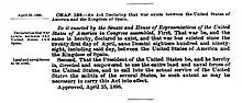 On April 20, 1898, McKinley signed a joint Congressional resolution demanding Spanish withdrawal and authorizing the President to use military force to help Cuba gain independence.[22] In response, Spain severed diplomatic relations with the United States on April 21. On the same day, the U.S. Navy began a blockade of Cuba.[23] Both sides declared war; neither had allies.