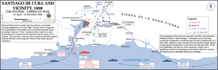 From June 22 to 24, the Fifth Army Corps under General William R. Shafter landed at Daiquirí and Siboney, east of Santiago, and established an American base of operations. A contingent of Spanish troops, having fought a skirmish with the Americans near Siboney on June 23, had retired to their lightly entrenched positions at Las Guasimas. An advance guard of U.S. forces under former Confederate General Joseph Wheeler ignored Cuban scouting parties and orders to proceed with caution. They caught up with and engaged the Spanish rearguard of about 2,000 soldiers led by General Antero Rubín[115] who effectively ambushed them, in the Battle of Las Guasimas on June 24. The battle ended indecisively in favor of Spain and the Spanish left Las Guasimas on their planned retreat to Santiago.